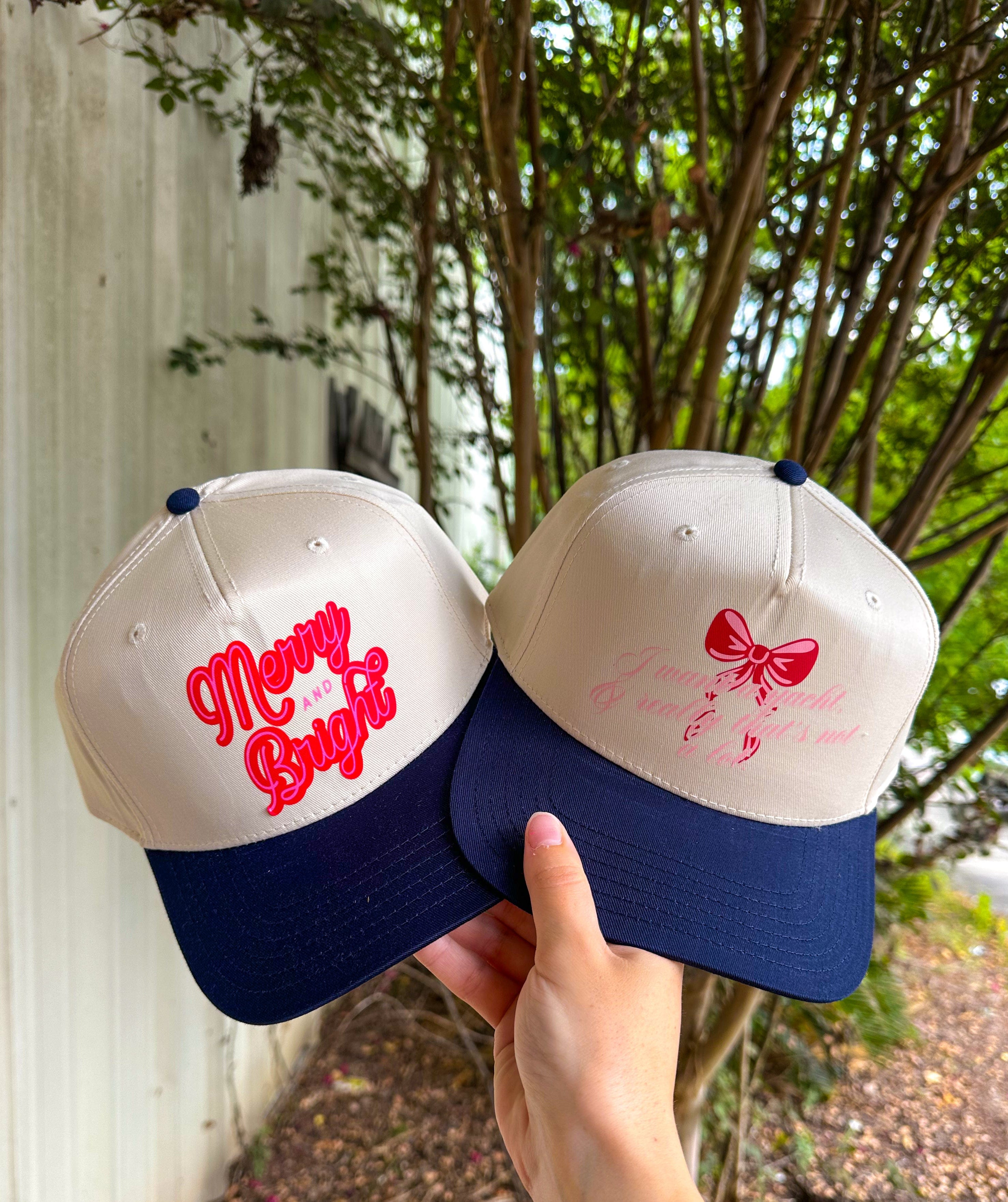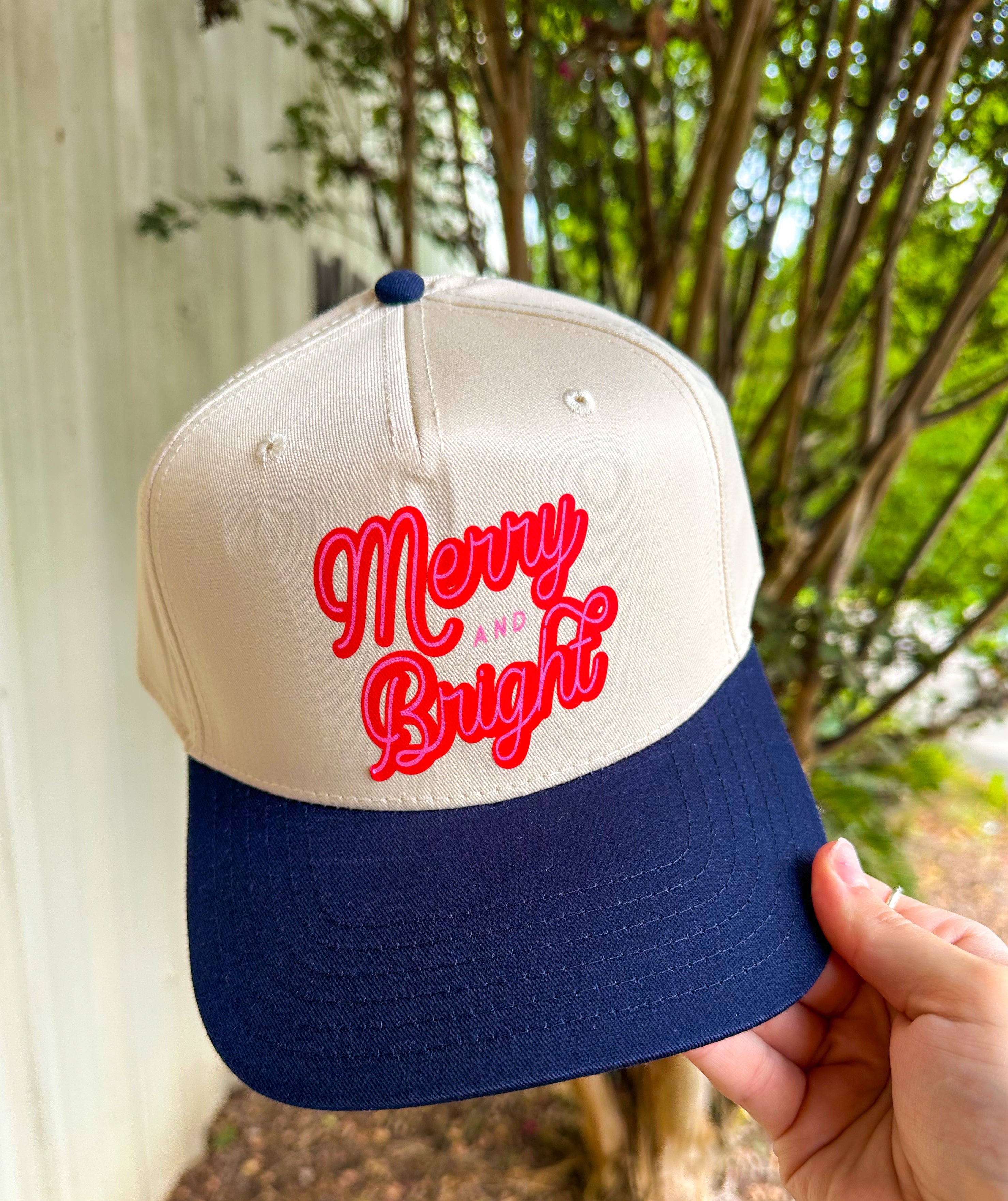 Get into the holiday spirit with our Merry & Bright Cream/Navy Canvas Trucker Hat. This stylish and festive accessory features a navy Christmas trucker design that is sure to make you stand out. Made with durable canvas material, it's the perfect way to show off your holiday cheer while staying comfortable and stylish.