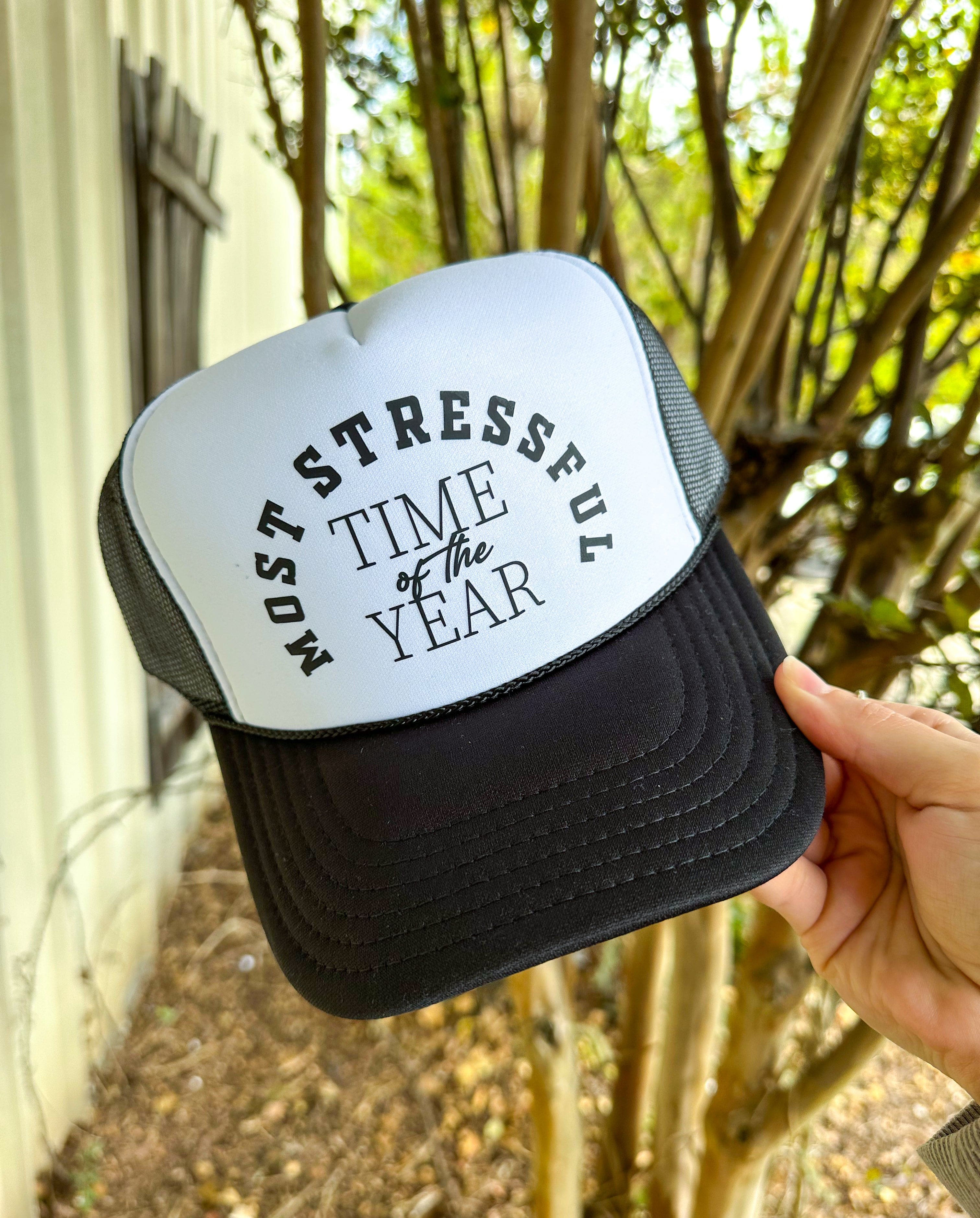 Most Stressful Time Of The Year Black & White Trucker Hat