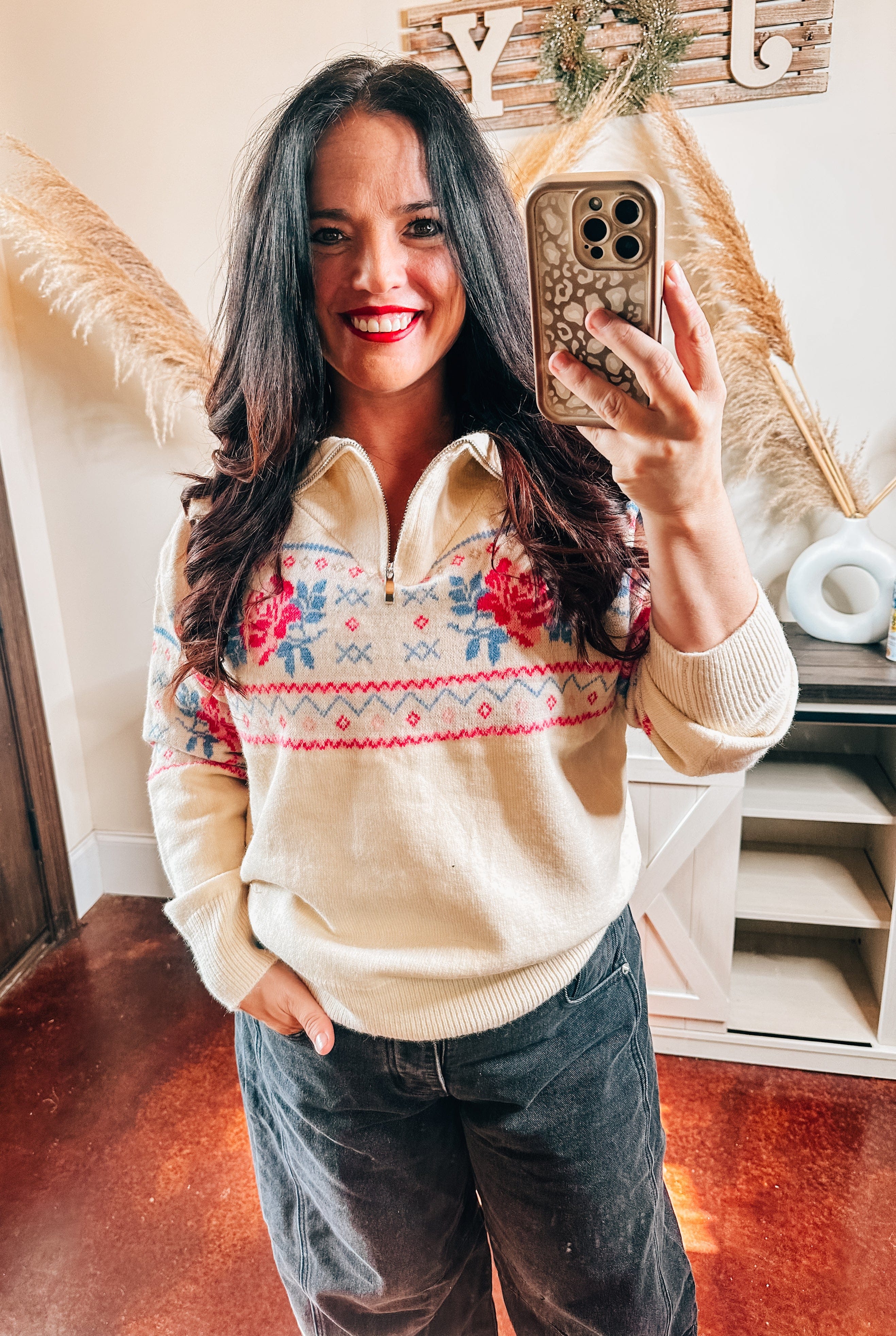 Cozy meets chic in our Ivory Pullover with Floral Details, designed with a cream base and playful pops of pink and blue. Featuring a classic half-zip neckline, soft knit fabric, and a timeless Fair Isle pattern with romantic floral details, this sweater brings warmth and charm to your wardrobe. Perfect for pairing with jeans or lounge pants, it's the ideal knit for holiday gatherings, cozy weekends at home, or adding a feminine touch to your everyday style.