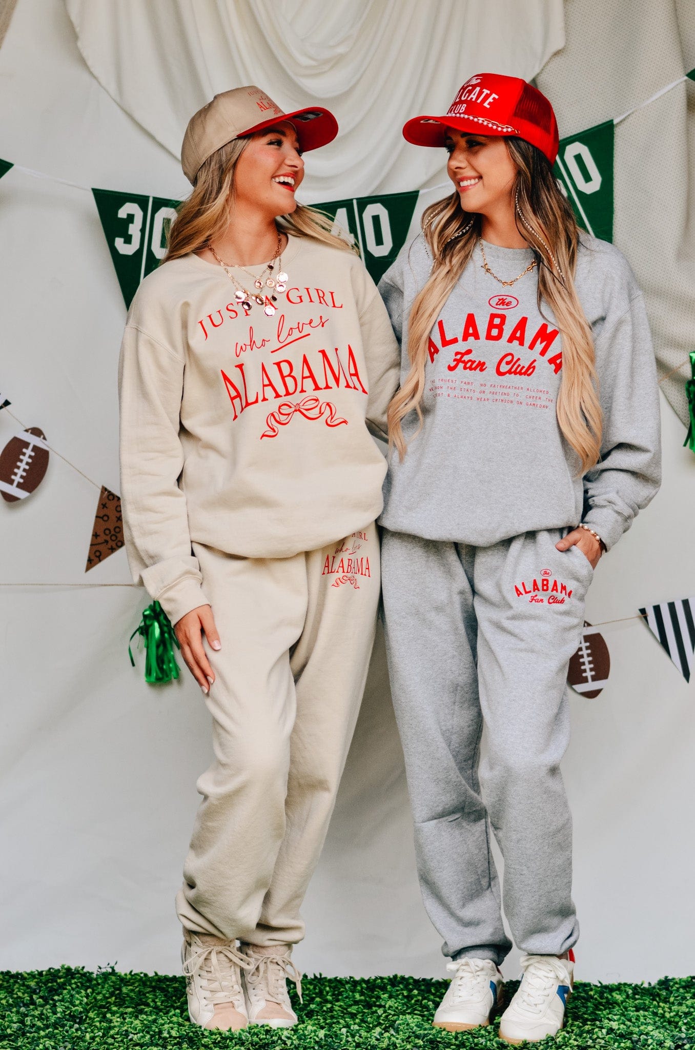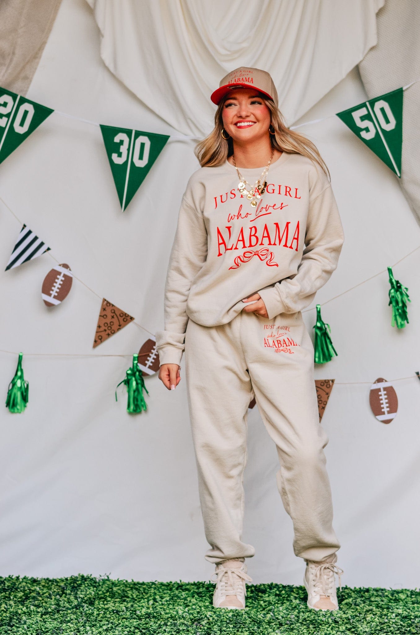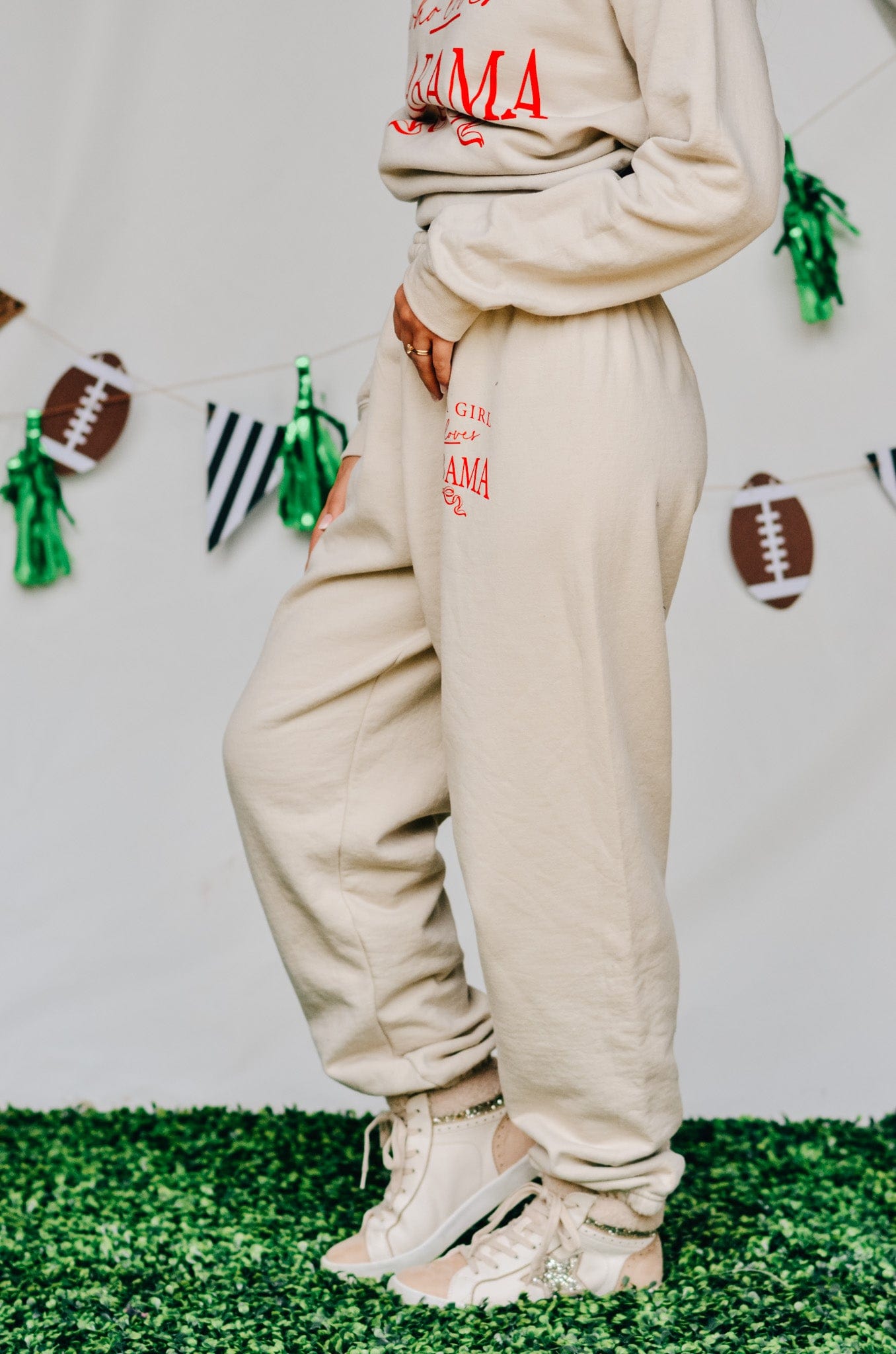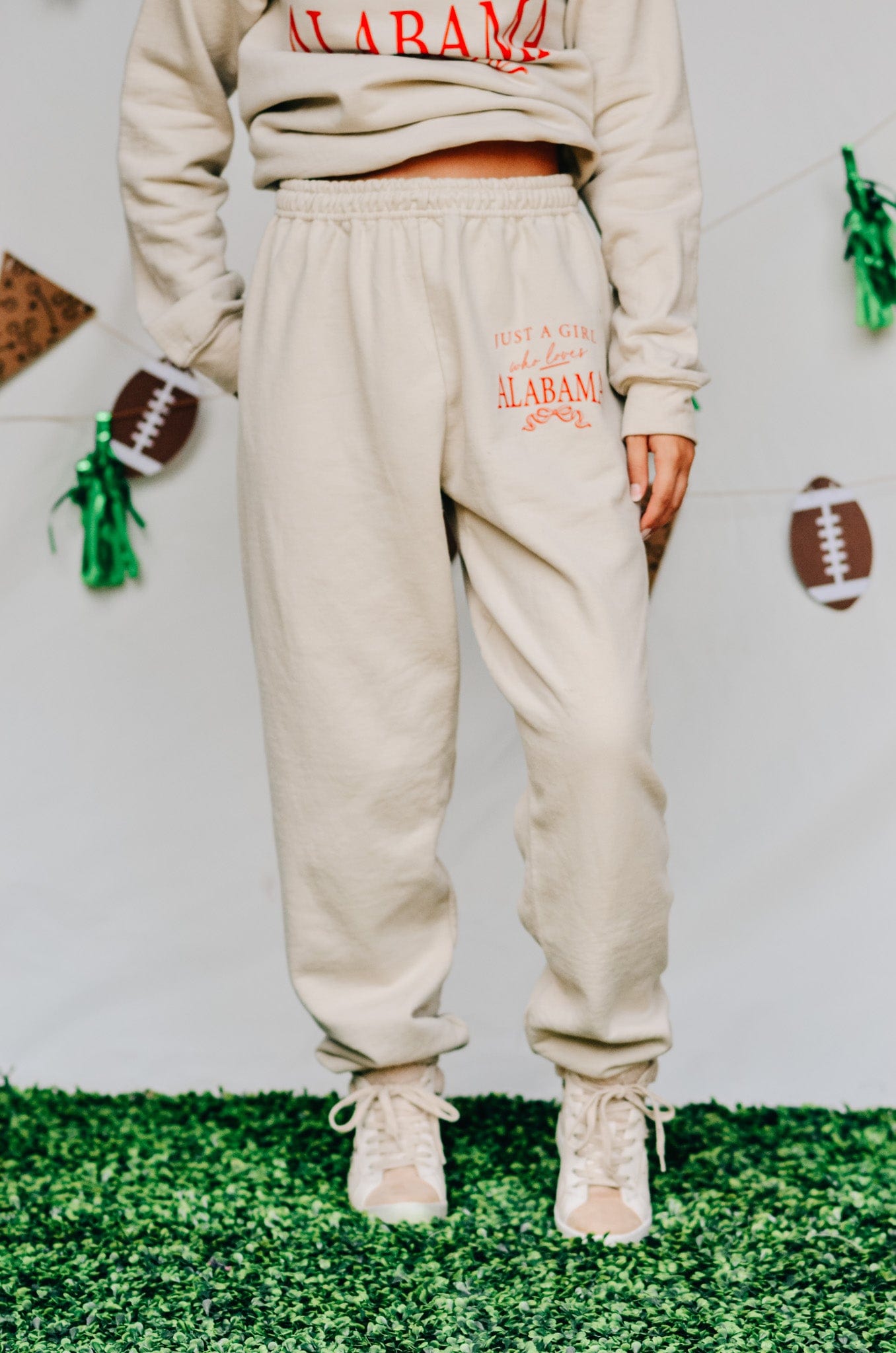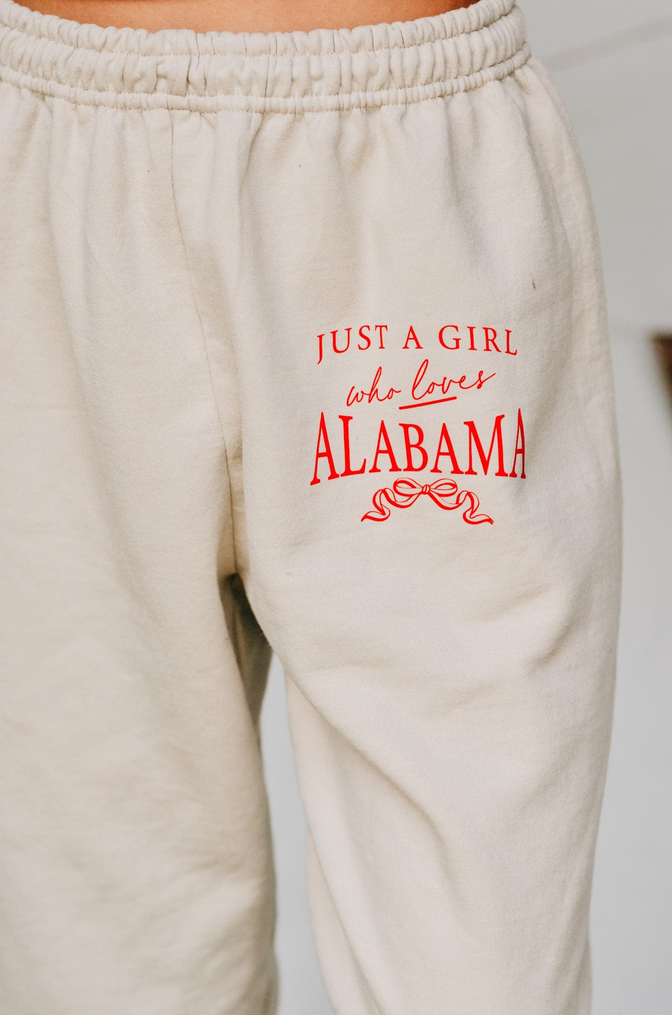 Cute, comfy, and Crimson Tide approved. These tan fleece joggers feature matching red Just a Girl Who Loves Alabama text on the hip, with a relaxed fit that’s made for football Saturdays and beyond.