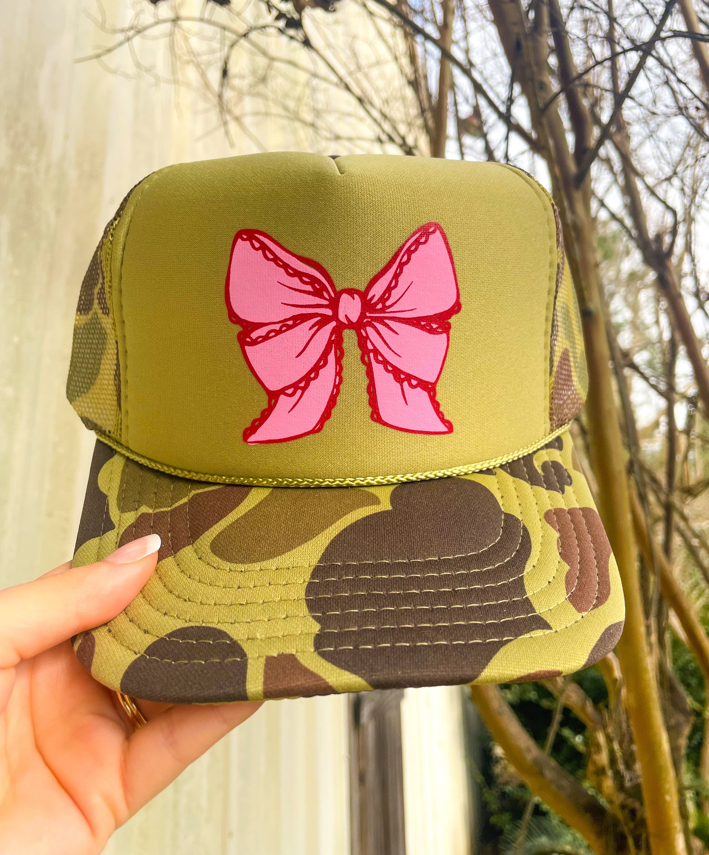 Two-Toned Camo Foam Trucker Hat – Pink & Red Lace Bow Graphic