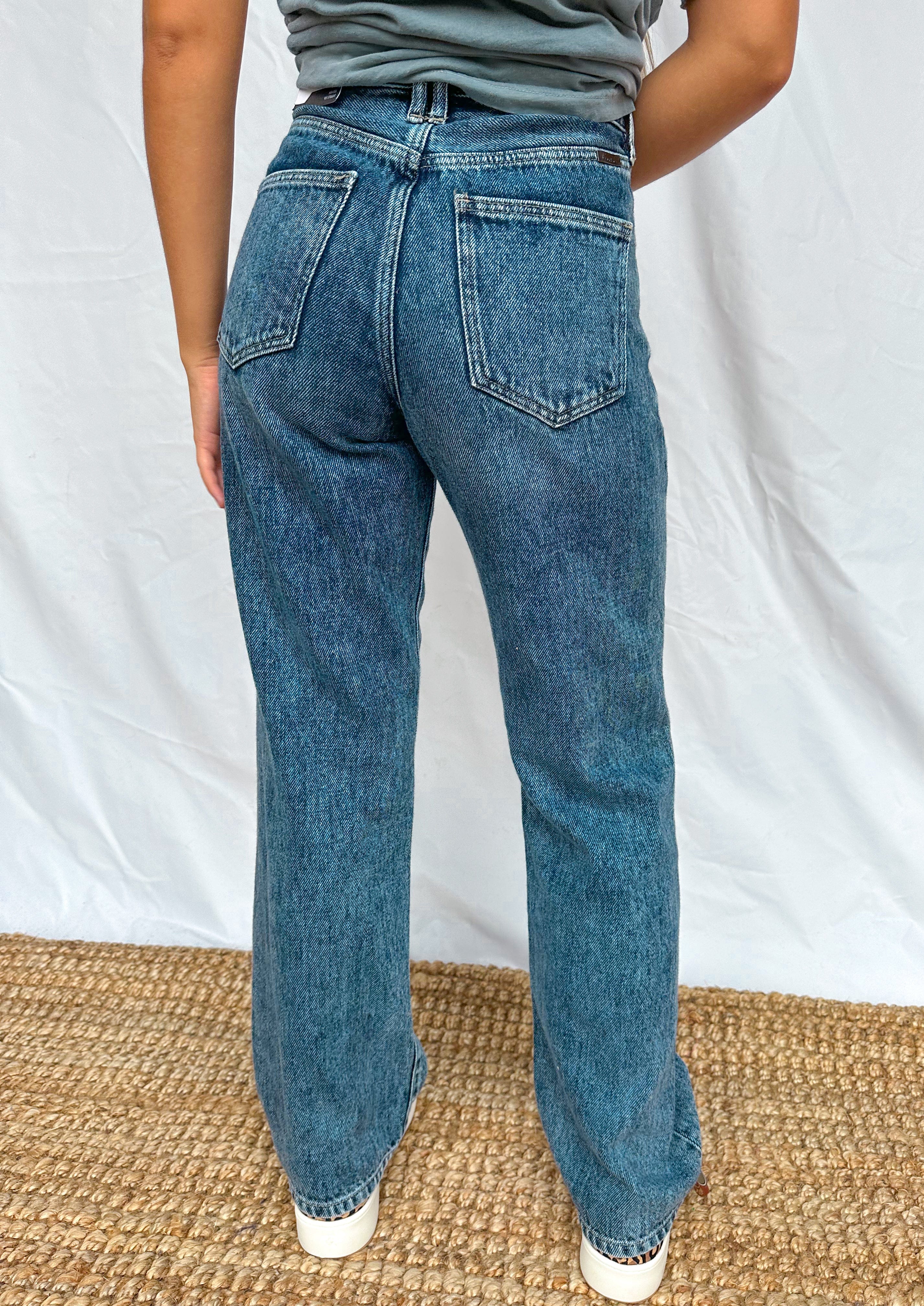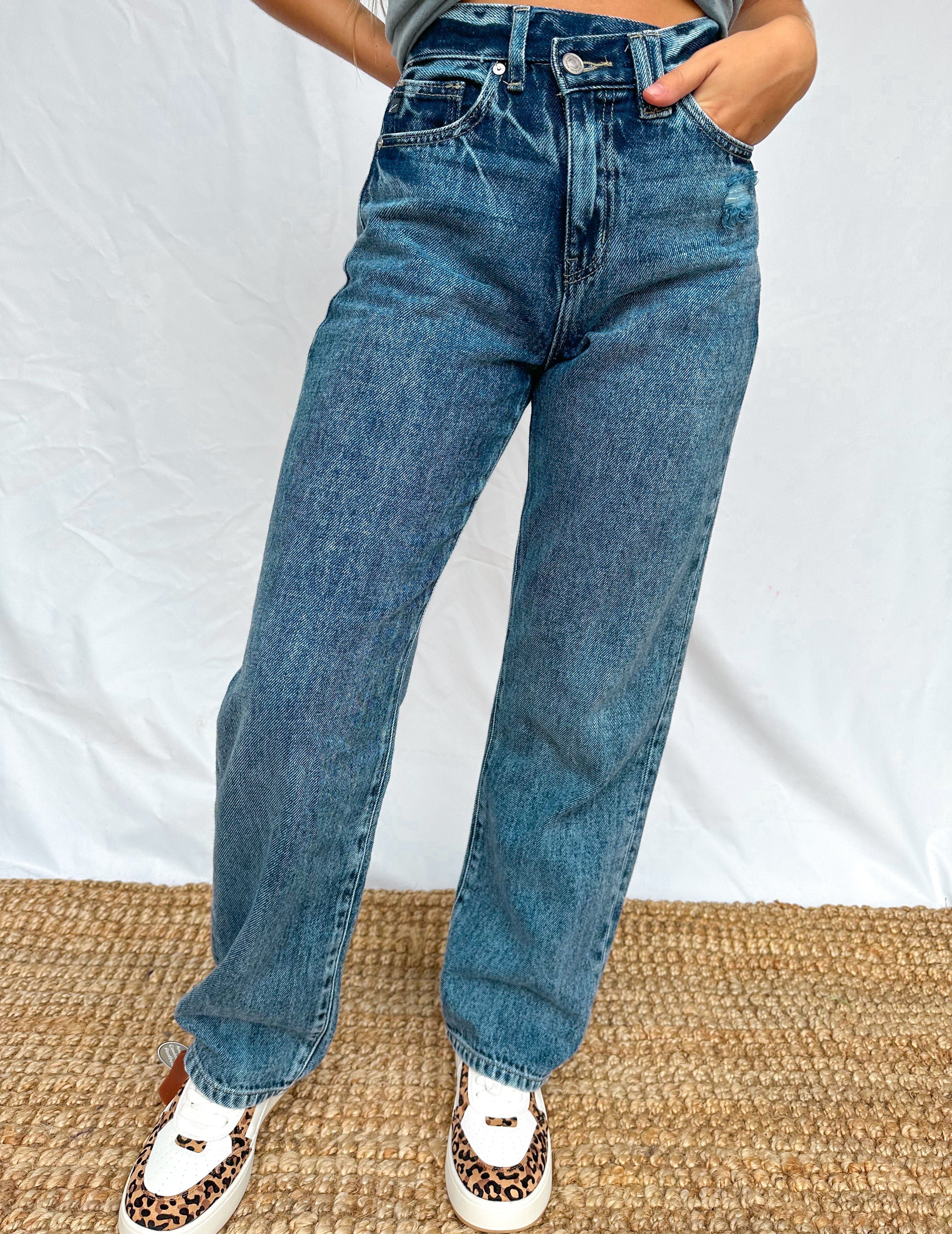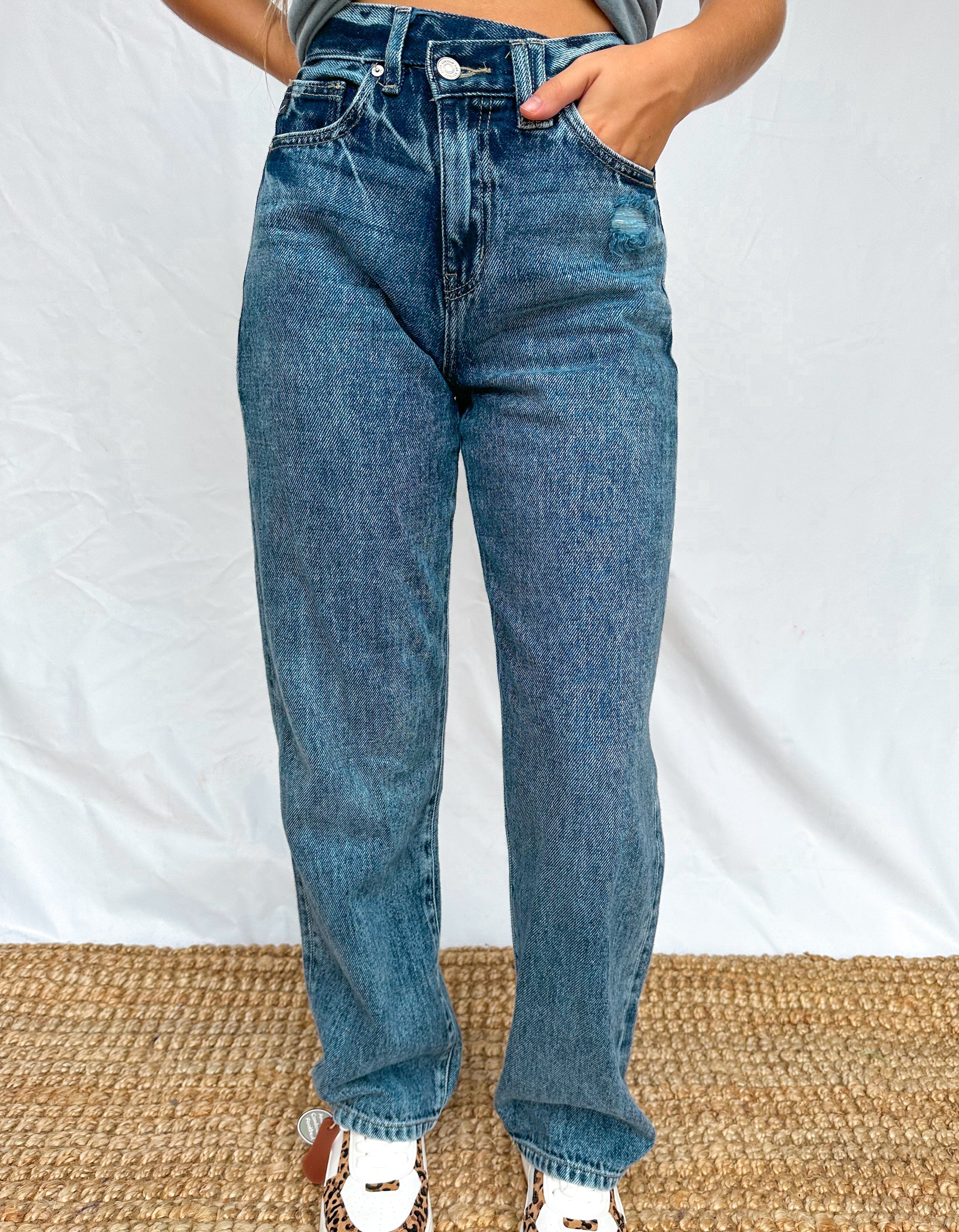 Make a statement in these retro-inspired 90's High Rise Jeans - featuring a dark acid wash, with one distressed hole, and a straight leg for a classic, yet unique look and feel. They even include a criss-cross waist for a modern twist! Embrace your inner 90's kid and show off your edgy style with a pair of these jeans! #BringBackThe90s!