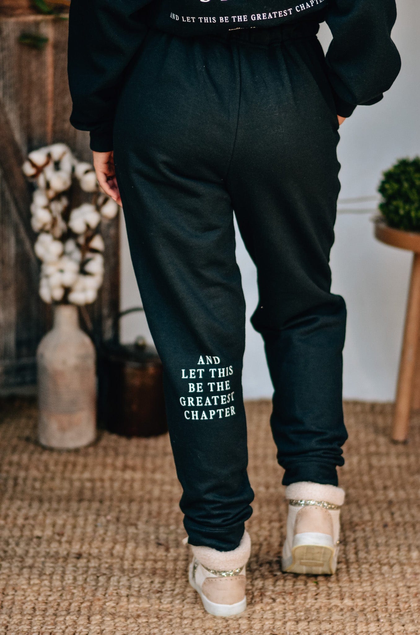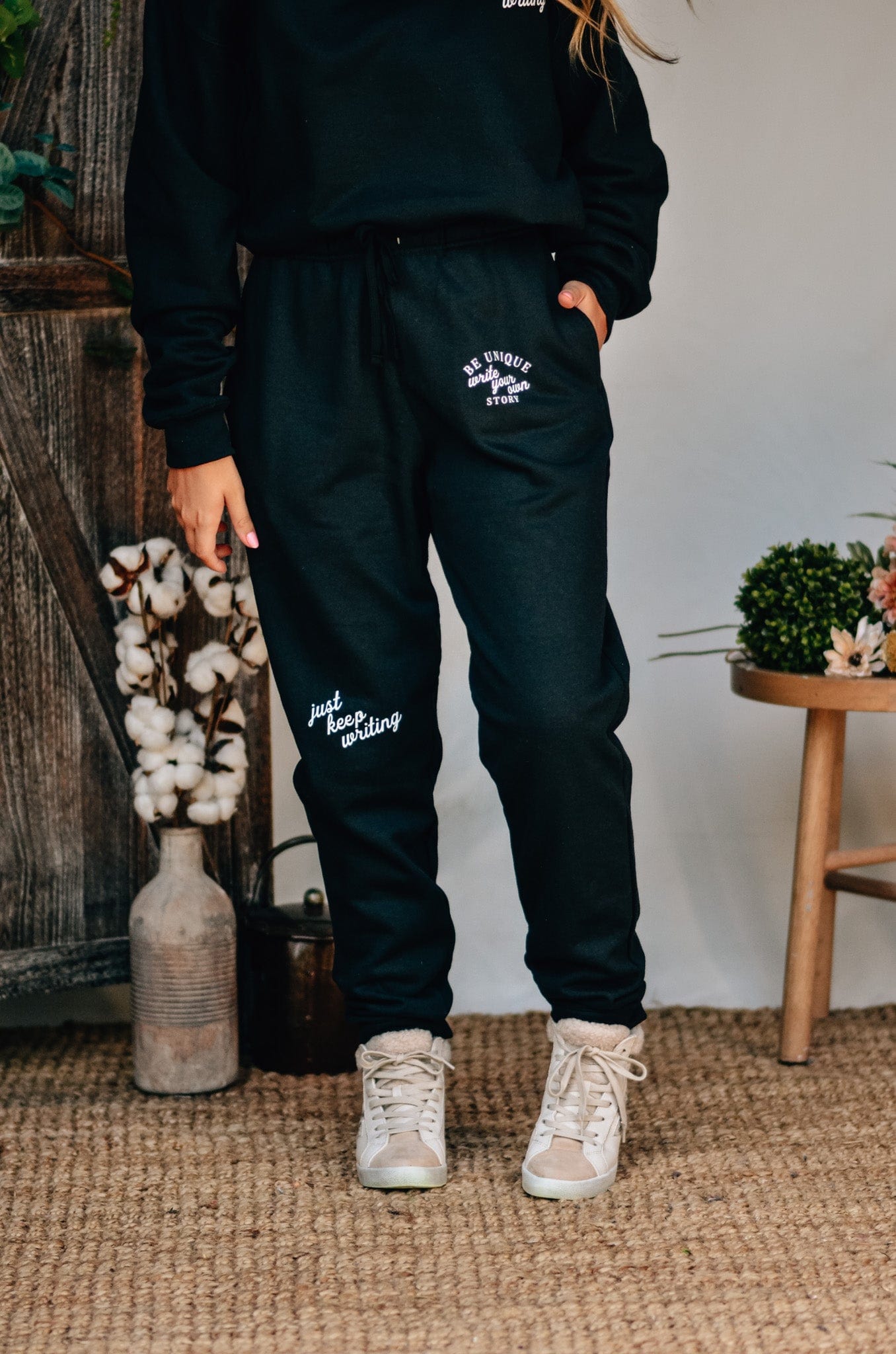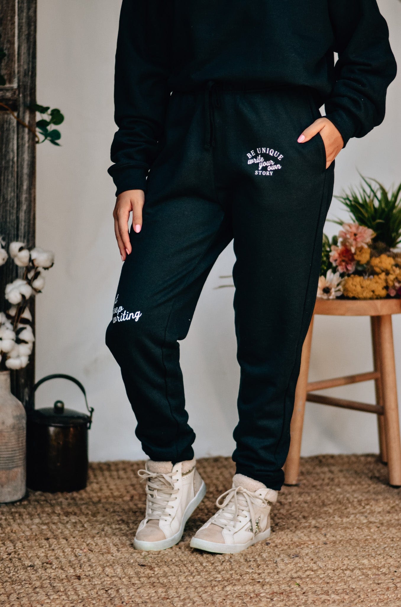 Make a statement with comfort in our black “Be Unique” joggers. With inspiring phrases like “Write Your Own Story” and “Let This Be the Greatest Chapter,” these joggers are as empowering as they are comfy. Complete the look with the matching sweatshirt for a set that’s equal parts stylish and motivational.