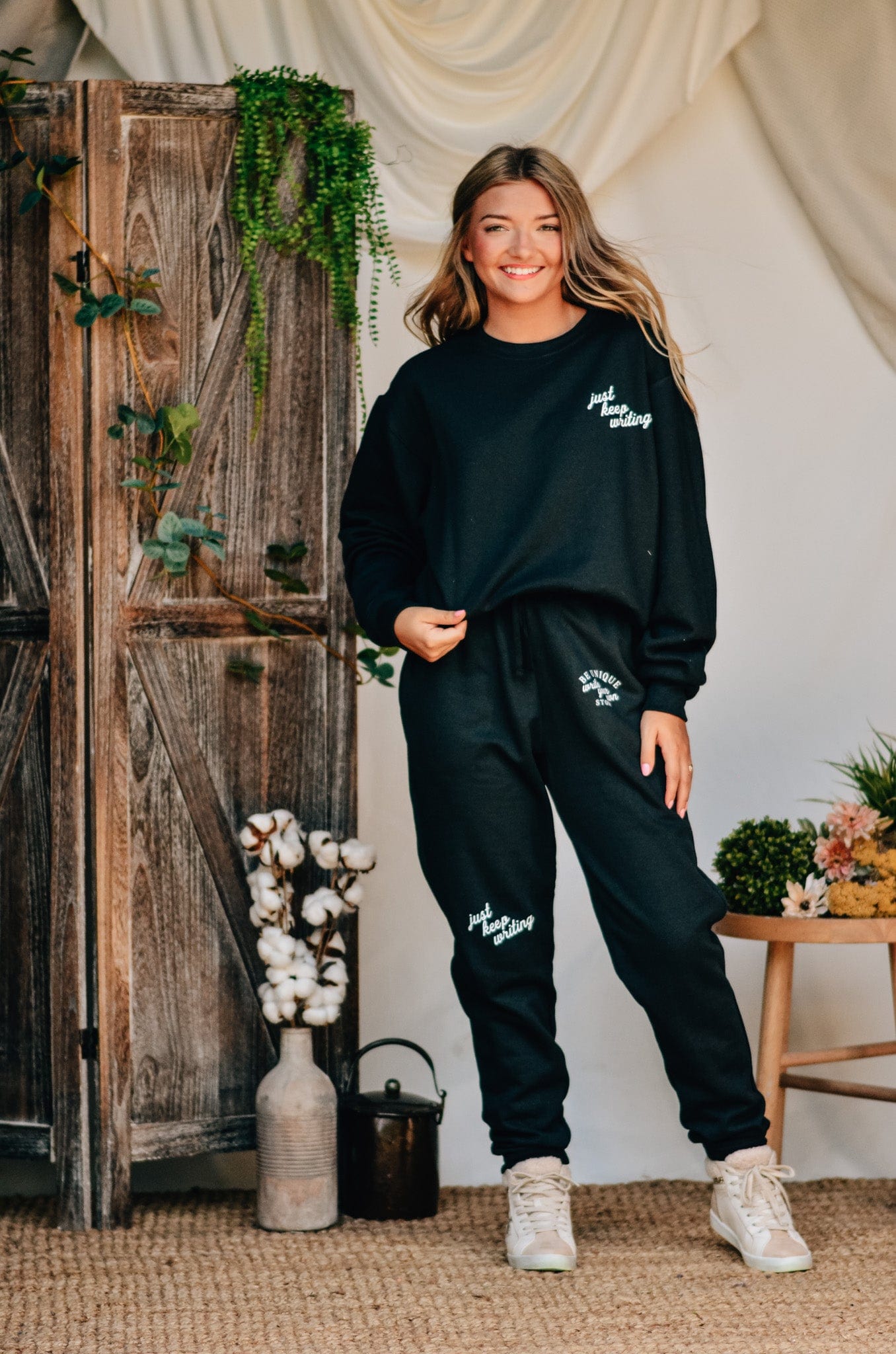 This cozy black sweatshirt is your daily reminder to be unapologetically you. Featuring “Just Keep Writing” on the front and a bold “Be Unique, Write Your Own Story” message on the back, it’s made for those who live authentically and lead with heart. Pairs perfectly with our matching joggers for a full look that speaks volumes.