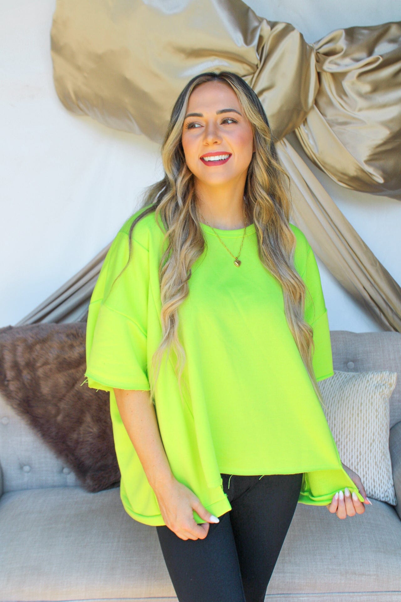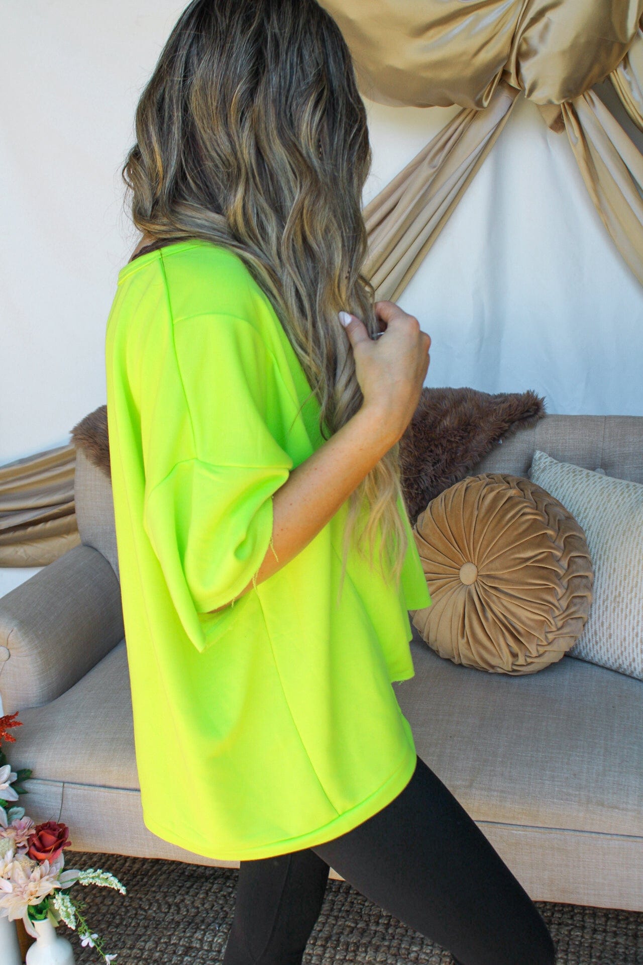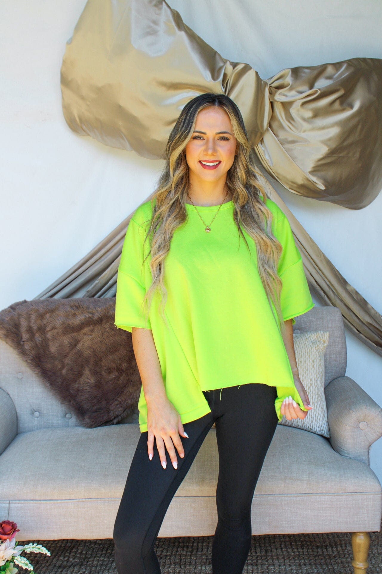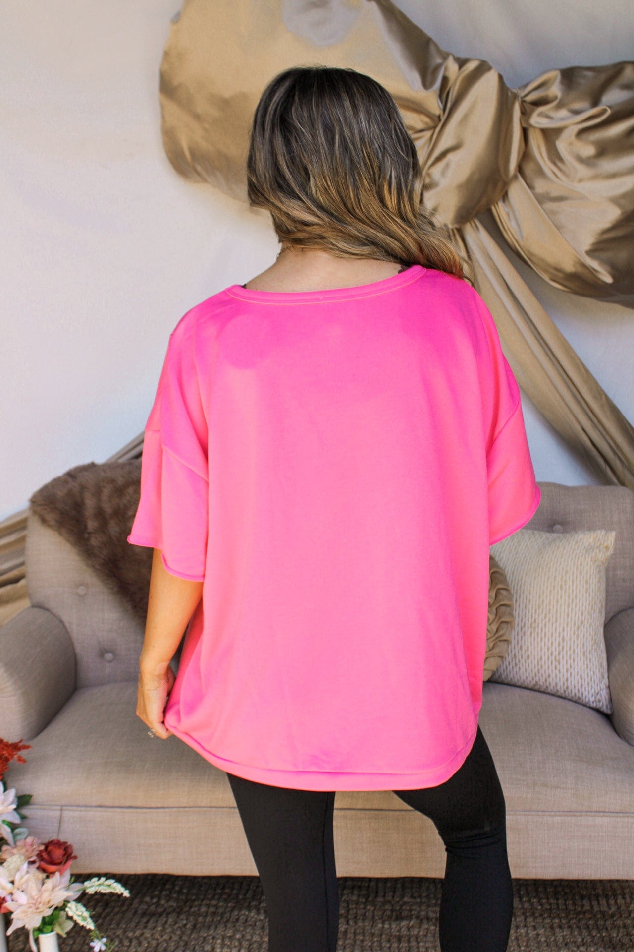 This top is a trendy and versatile addition to your wardrobe. Its unique high-low hemline gives a modern twist to a classic t-shirt style. The fabric creates a casual look that is perfect for everyday wear. This t-shirt can easily be dressed up or down, making it a versatile piece that can take you from day to night. Available in three colors : hot pink, lime green, and black.