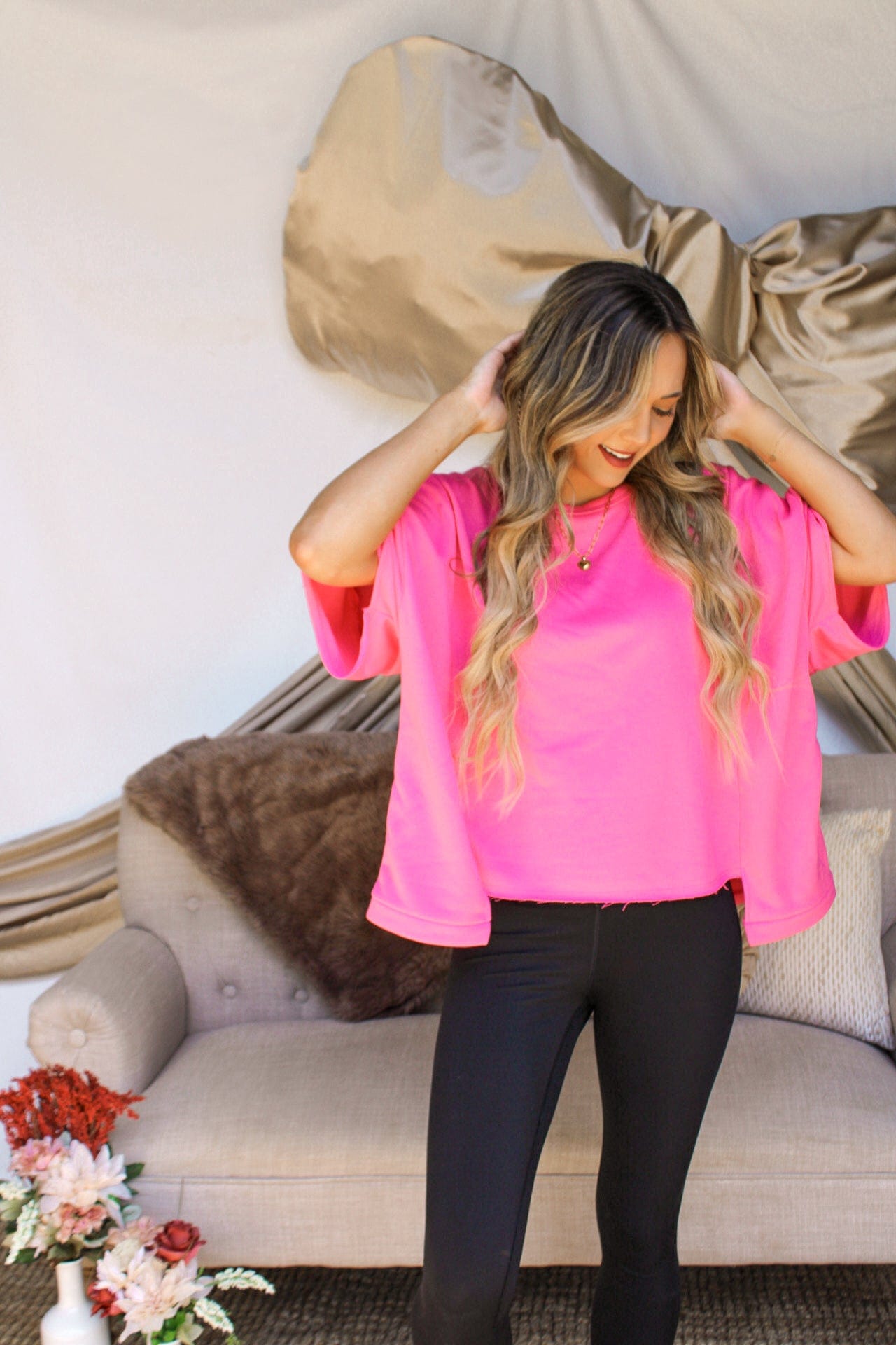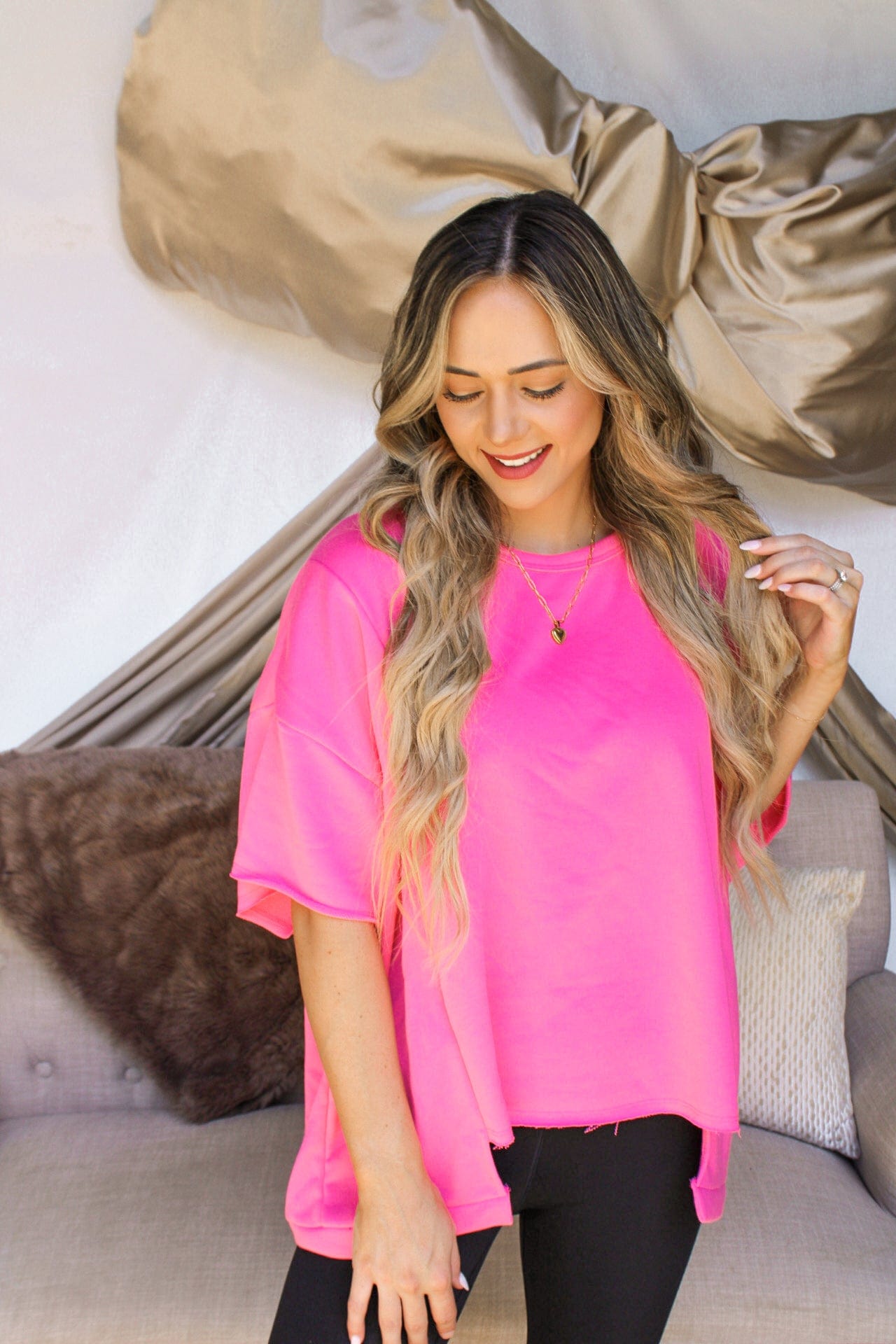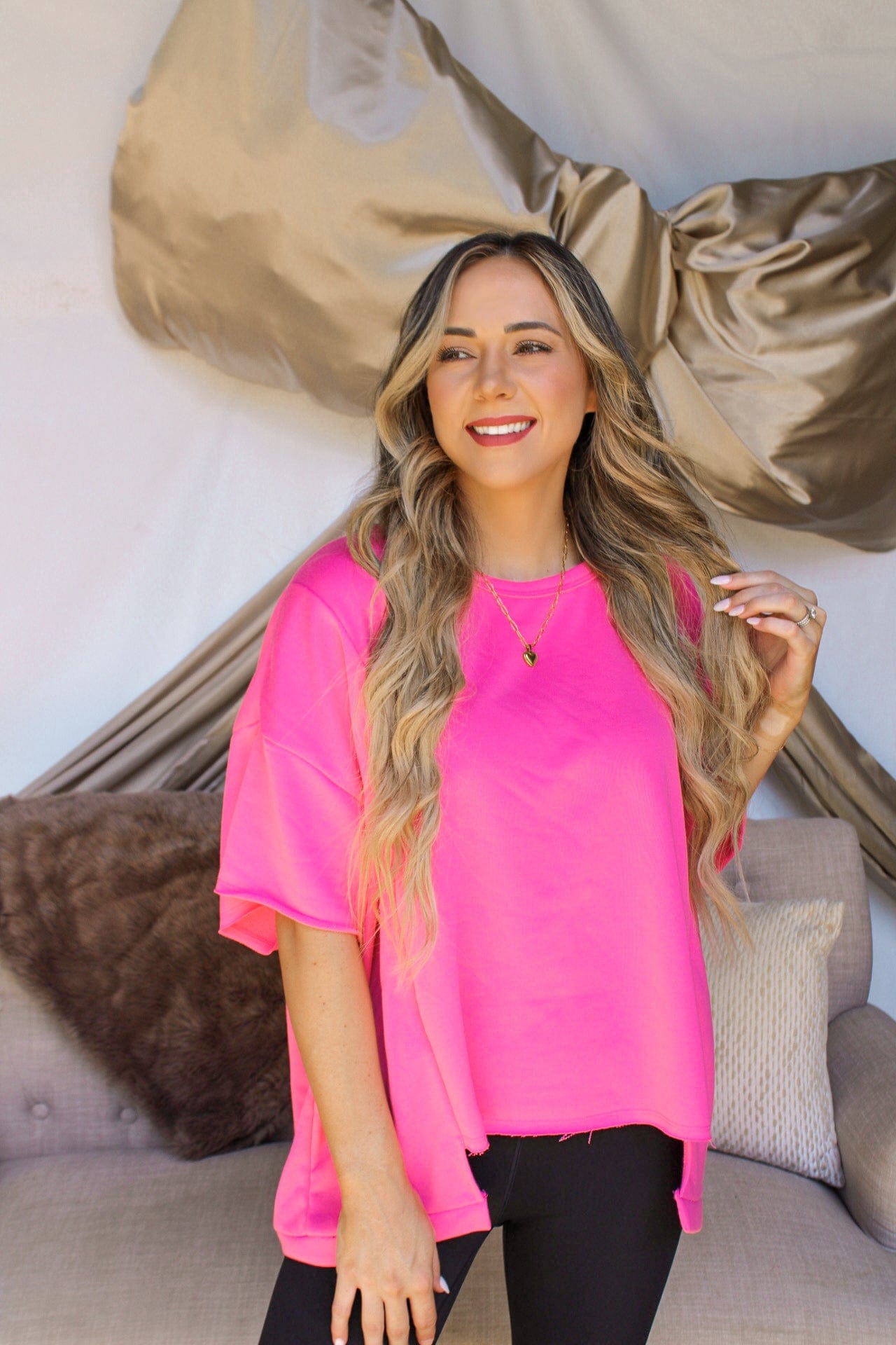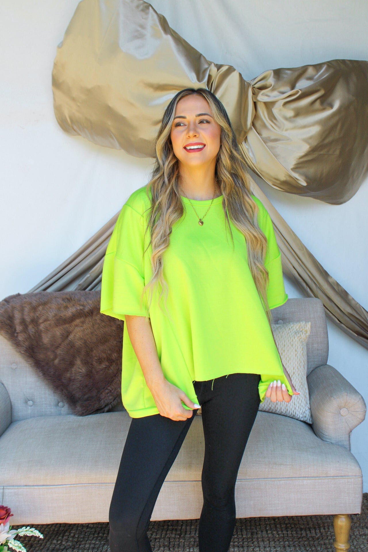 This top is a trendy and versatile addition to your wardrobe. Its unique high-low hemline gives a modern twist to a classic t-shirt style. The fabric creates a casual look that is perfect for everyday wear. This t-shirt can easily be dressed up or down, making it a versatile piece that can take you from day to night. Available in three colors : hot pink, lime green, and black.