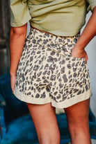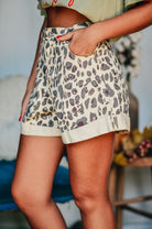 Give your denim collection a chic new update with these trendy shorts! Their bold leopard print adds a playful touch to any outfit. - Unlined denim material with a cream, chestnut, and grey colored leopard print - A waistline with belt loops and an elastic back - Functional front and back pockets - Pleated accents on the front - A flattering silhouette that ends in cuffed hemlines