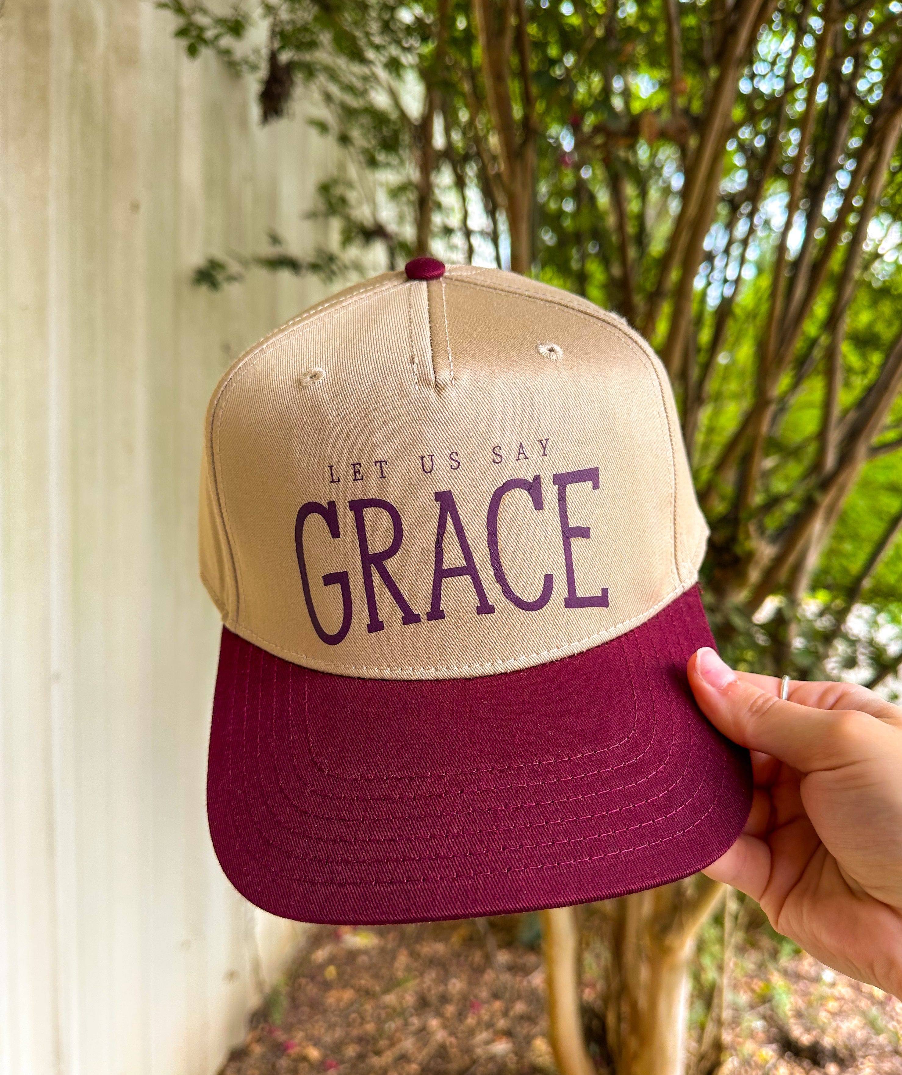Let Us Say GRACE Tan/Maroon Canvas Trucker Hat