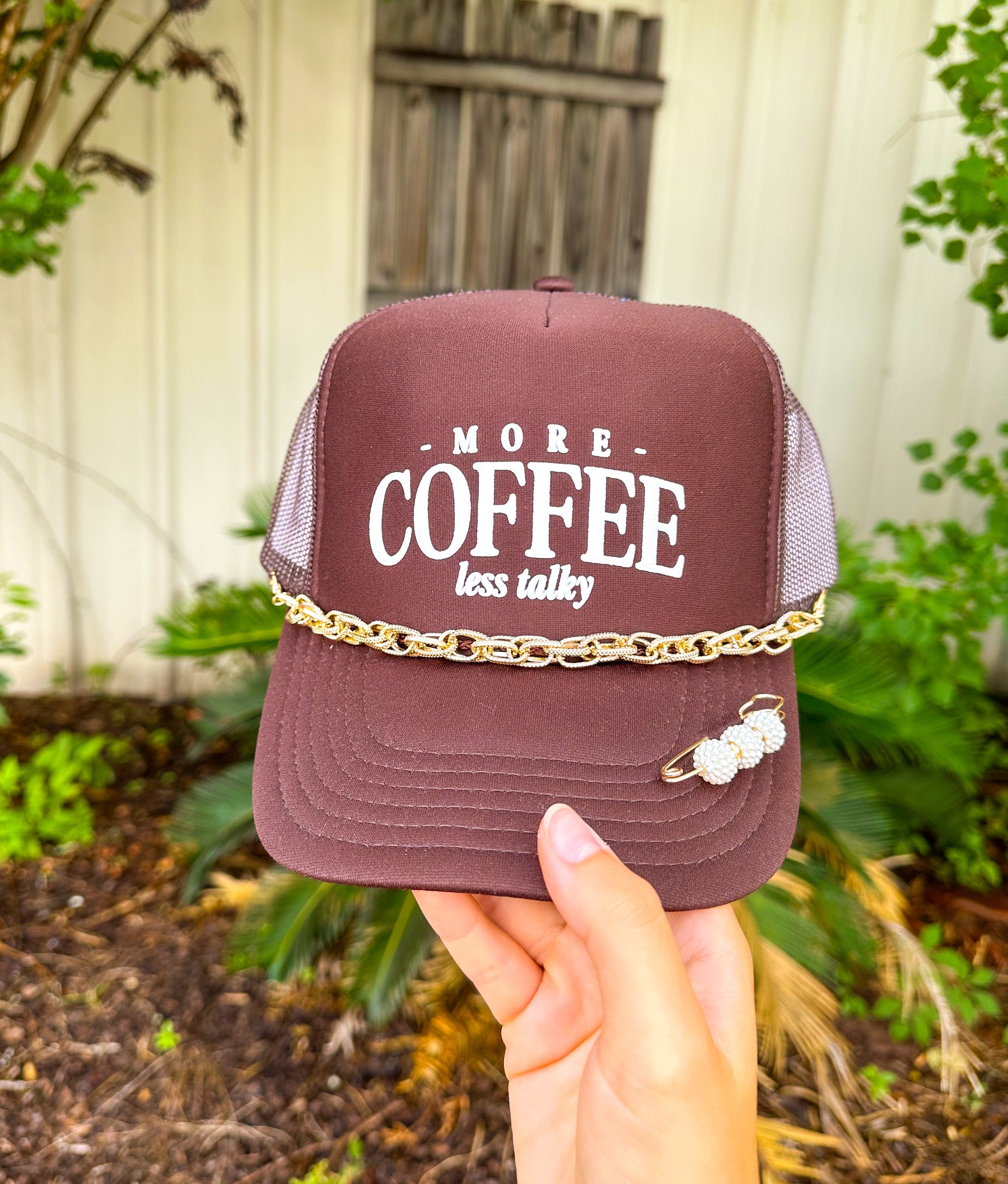More Coffee Less Talky With Chain/Pin Brown Trucker
